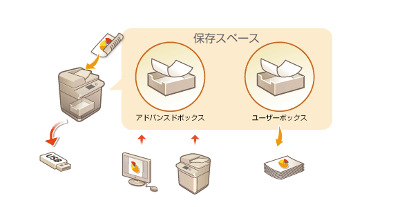 本機に搭載されているハードディスクには、読み込んだ文書を保存して共有したり編集したりすることができる「保存スペース」が確保されています。また、外部の保存スペースとして、メモリーメディアを接続して使うこともできます。用途に応じて、最適な保存スペースを活用してください。