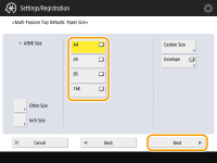 2 | Select the type of envelopes. ![]() To register a custom size envelope, press <Custom> <Next> and press <X> or <Y> to specify the side, then use the numeric keys to enter the length of the specified side. |