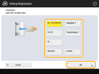 2 | Select the type of envelopes. ![]() To register a custom size envelope, press <Custom> <Next> and press <X> or <Y> to specify the side, then use the numeric keys to enter the length of the specified side. |