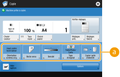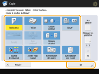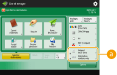 Le nombre et l'emplacement des options de réglage affichées sur l'écran des fonctions de base diffèrent d'une fonction à l'autre. Un bouton de raccourci ne s'affiche pas si <Non attribué> est défini comme raccourci. La limite quant au nombre de raccourcis pour des <Options> enregistrables est la suivante. Copie : 5 Télécopie : 4 Numérisation et envoi : 2 |
