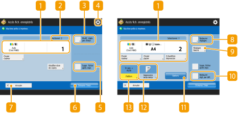 Les réglages d'impression enregistrés dans <Modifier réglages par défaut> s'appliquent aux fichiers lorsque l'enregistrement a été effectué depuis la fonction <Lire et mémoriser> (<Réglages Accès aux fichiers enregistrés>