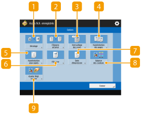Lorsque vous appuyez sur <Accès aux fichiers enregistrés> dans l’écran <Menu principal>, puis sur <Boîte aux lettres>, <Espace avancé>, <Réseau> ou <Support mémoire> pour imprimer des fichiers, l'écran de réglage suivant s'affiche.