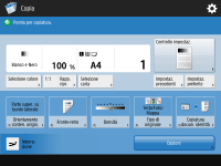 Qui sono elencati i pulsanti che richiamano le funzioni base della macchina. Se vi sono pulsanti che non rientrano sullo schermo, premere  e  nella parte inferiore dello schermo per cambiare la visualizzazione. I pulsanti mostrati sullo schermo possono variare in base alle opzioni installate.