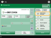 Per verificare il numero totale di destinazioni specificateIl numero totale di destinazioni specificate viene visualizzato in alto a destra della schermata. Ciò consente di verificare che il numero di destinazioni sia corretto prima dell'invio. ![]() Per inviare con le informazioni del mittenteÈ possibile effettuare l'invio con il nome e il numero di fax del mittente. <ID terminale TX> Per controllare lo stato dei documenti inviatiSulla schermata <Monitoraggio stato/Annulla>, è possibile verificare lo stato dei documenti inviati. Questa schermata consente di inviare nuovamente i fax o di annullare l'invio dopo aver verificato lo stato. Controllo di stato e registro per i documenti inviati e ricevuti Se <Visualizzazione notifica ad accettazione lavoro> è impostato su <On>, la schermata <Monitoraggio stato/Annulla> potrebbe essere visualizzata dalla seguente schermata, visualizzata dopo la ricezione di un lavoro inviato. <Visualizzazione notifica ad accettazione lavoro> ![]() Quando si verifica un errore di trasmissione perché la linea del destinatario è occupataLa macchina compone nuovamente il numero in automatico dopo un certo periodo di tempo. È possibile cambiare le impostazioni, ad esempio il numero di volte che la macchina ricompone il numero e l'intervallo tra un tentativo e l'altro. <Ricomposizione automatica> Per stampare il rapporto dei risultati dell'invioNella schermata delle funzioni principali fax, se si preme <Opzioni> <Rapporto TX> è possibile impostare la stampa automatica del rapporto che elenca i risultati dell'invio.Per impostare per ogni lavoro da <Opzioni>, è necessario selezionare <Solo se errore> o <Off> in <Rapporto TX>, quindi impostare <Consentire stampa da Opzioni> su <On>. Quando si alimentano più fogliLa scansione si arresta e viene visualizzato il messaggio sullo schermo. Seguire le istruzioni per rimuovere l'inceppamento. Dopo aver eliminato l'inceppamento, viene visualizzata la schermata di ripresa del lavoro. Se la macchina rileva erroneamente l'alimentazione di più fogli, premere <Non rilev.alim.più fogli da alimen.> per riprendere la scansione. Per impostare anticipatamente la macchina per la notifica dell'alimentazione di più fogli, eseguire una delle operazioni indicate. Ogni volta che si invia, premere <Opzioni> nella schermata delle funzioni principali fax selezionare <Rilev. alim. più fogli da alimen.> per disattivare l'impostazione.Impostare <Impost. rilev.alim. più fogli da alimentat. come default> su <Off> (<Impost. rilev.alim. più fogli da alimentat. come default>). Se le foto nell'immagine inviata sono troppo chiare o scure, i colori dello sfondo degli originali non possono essere rimossiLa qualità dell'immagine inviata può essere migliorata se si osservano le seguenti condizioni/impostazioni. Tipo di lavoro: fax (invio memoria) o scansione e invio (Fax/I-fax) <Selezione colore>: <Bianco e Nero> (Scansione e invio) <Tipo di originale>: <Testo> <Densità> <Densità sfondo>: <Autom.><Risoluzione>: 200 dpi x 400 dpi, 300 dpi x 300 dpi*, 400 dpi x 400 dpi, o 600 dpi x 600 dpi* *Impostabile per Scansione e invio <Priorità velocità/qualità immagine per scansione B&N> Lavori di invio fax/I-Fax: <Priorità qualità> (<Priorità velocità/qualità immagine per scansione B&N>)Quando sono impostate più linee telefonicheÈ possibile selezionare la linea telefonica da utilizzare per l'invio dei fax premendo <Opzioni> <Selezione linea>. Per istruzioni su come specificare le impostazioni della linea fax, vedere Impostazioni della linea fax. |