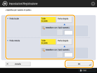 3 | Specificare la porta a cui applicare l'IPSec. Premere <Specifica per numero di porta> per utilizzare i numeri di porta quando si specificano le porte a cui applicare l'IPSec. Selezionare <Tutte le porte> per applicare l'IPSec a tutti i numeri di porta. Per applicare l'IPSec ad un numero di porta specifico, premere <Porta singola> e inserire il numero di porta. Dopo aver specificato le porte, premere <OK>. Specificare la porta di questa macchina in <Porta locale> e specificare la porta del peer di comunicazione in <Porta remota>. ![]() Premere <Specifica per nome servizio> per utilizzare i nomi dei servizi quando si specificano le porte a cui si applica l'IPSec. Selezionare il servizio nell'elenco, premere <Servizio On/Off> per impostarlo su <On> e premere <OK>. ![]() | ||||||||||||||