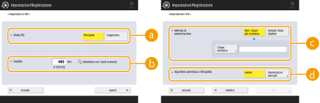 2 | Configurare le impostazioni necessarie. ![]() <Validità>Impostare il periodo di scadenza dell'IPSec SA generato. Assicurarsi di impostare <Interv.> o <Dimensione>. Se si impostano entrambi, viene applicata l'impostazione con il valore raggiunto per primo. <PFS>Se si imposta la funzione Perfect Forward Secrecy (PFS) su <On>, la segretezza del codice di crittografia aumenta, ma la velocità di comunicazione diminuisce. Inoltre, la funzione PFS deve essere abilitata sul dispositivo del peer di comunicazione. <Algoritmo autenticaz./crittografia>Selezionare <Autom.> o <Impostazioni manuali> per impostare come specificare l'algoritmo di autenticazione e crittografia per IKE fase 2. Se si seleziona <Autom.>, l'algoritmo di autenticazione e crittografia ESP viene impostato automaticamente. Se si desidera specificare un determinato metodo di autenticazione, premere <Impostazioni manuali> e selezionare uno dei metodi di autenticazione descritti di seguito.