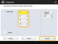 2 | Seleccione el tipo de sobres. ![]() Para registrar un sobre de tamaño personalizado, pulse <Personalizado> <Siguiente> y pulse <X> o <Y> para especificar la cara y, a continuación, introduzca la longitud de cada cara con las teclas numéricas. |