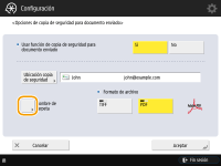 Se guarda una copia del documento incluso si se produce un error de envío. Pueden aplicarse las siguientes restricciones, dependiendo del tipo de destino. Correo electrónico: se envía un correo electrónico sin mensaje. Fax/I-Fax: el fax enviado no puede guardarse como un archivo electrónico. |