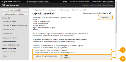 No modifique ni elimine los datos de los que se ha hecho una copia de seguridad, ya que podría impedir la correcta restauración de los mismos. No realice una copia de seguridad mientras el equipo está siendo manejado desde el panel de control o la IU remota. |