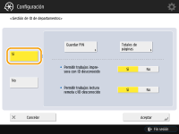 3 | Introduzca el ID de departamento y el PIN, y pulse <Aceptar>. ![]() <ID dpto.>Introduzca un número de 7 dígitos o menos para el ID de departamento. <PIN>Introduzca un número de un máximo de 7 dígitos para el PIN y pulse <Confirmar>. Vuelva a introducir el PIN a modo de confirmación y pulse <Aceptar>. Si no desea establecer un PIN, deje este elemento en blanco. ![]() No podrá registrar un ID de departamento o un PIN que contenga únicamente ceros, como por ejemplo "00" o "0000000". Aunque se introduzcan menos de siete dígitos, se añaden ceros al inicio del número y se configura un número de siete dígitos. Puede pulsar <Activar/des. límite y fijar límite páginas> para configurar el número total de páginas que puede el departamento puede copiar, escanear e imprimir. También puede establecer como requisito la introducción de siete dígitos para los ID de departamento y para los PIN. Para obtener más información, póngase en contacto con su distribuidor autorizado de Canon. Si se alcanza cualquiera de los límites de páginas en color o blanco y negro mientras se imprime un documento con zonas tanto en color como en blanco y negro, el equipo se detendrá. Si se alcanza cualquiera de los límites de impresiones o copias totales en color o blanco y negro mientras se copia un documento con zonas tanto en color como en blanco y negro, el equipo se detendrá. |