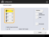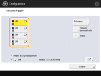 Si no se muestra el tipo de papel cargado, pulse <Opciones detallad.> para seleccionarlo de una lista.