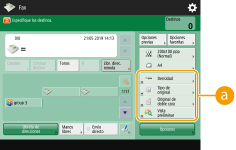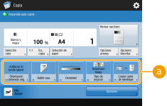 El número de opciones incluidas en la pantalla Funciones básicas y la ubicación donde aparecen varía según las funciones. No se mostrará un botón de acceso directo si <No asignado> se establece como acceso directo. El límite del número de accesos directos para <Opciones> que puede registrar es el siguiente. Copia: 5 Fax: 4 Leer y enviar: 2 |