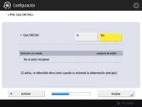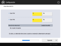 Especifique las opciones de la conexión de red. ![]() ![]() Pulse <Sí> para <Usar IPv4> o <Usar IPv6>, y pulse <Siguiente>. También puede utilizar IPv4 e IPv6. Si pulsa <No> para <Usar IPv4> y <Usar IPv6>, y pulsa <Aceptar>, omita las opciones de red y siga con el Paso 9. Si pulsa <Sí> para <Usar IPv4>, especifique las opciones siguientes. ![]() Para obtener la dirección IP automáticamente, pulse <DHCP> o <IP autom.>, y pulse <Siguiente> o <Aceptar>. Para configurar la dirección IP manualmente, quite la selección de <DHCP> o de <IP autom.>, pulse <Dirección IP>, <Máscara de subred> y <Dirección de puerta enlace> para introducir cada valor, y pulse <Siguiente> o <Aceptar>. Para obtener información sobre las opciones de la dirección IPV4, consulte Configurar una dirección IPv4. ![]() Si pulsa <Sí> para <Usar IPv6>, especifique las opciones siguientes. ![]() Pulse <Sí> para utilizar la dirección sin estado, o <No> para no utilizarla, y pulse <Siguiente>. Para obtener información sobre la dirección IPv6, consulte Configurar una dirección IPv6. ![]() Tras especificar la dirección sin estado, indique las opciones siguientes. ![]() Pulse <Sí> para utilizar la dirección manual, o <No> para no utilizarla, y pulse <Siguiente>. Para utilizar la dirección manual, pulse <Dirección manual>, <Longitud de prefijo>, y <Direc. enrutador prefij.> para introducir cada valor. ![]() Tras especificar la dirección manual, indique las opciones siguientes. ![]() Pulse <Sí> para utilizar DHCPv6 o <No> para no utilizar DHCPv6, y pulse <Aceptar>. | |