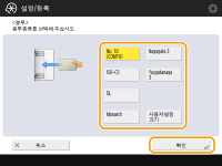 2 | 봉투 유형을 선택하십시오. ![]() 사용자 정의 크기 봉투를 등록하려면 <사용자설정 크기> <다음화면>을 누르고 <X> 또는 <Y>를 눌러 면을 지정한 후 숫자키를 이용해 지정된 면의 길이를 입력합니다. |