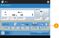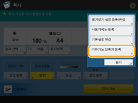 기본 특징 화면에 있는 설정 항목의 수와 표시될 위치는 기능에 따라 달라집니다. <할당없음>을 단축키로 설정하면 단축키 버튼이 표시되지 않습니다. 등록할 수 있는 <기타 기능>에 대한 단축키의 수는 다음과 같이 제한됩니다. 복사: 5 팩스: 4 스캔 및 전송: 2 |