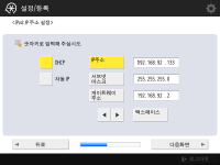 네트워크 연결 설정을 지정합니다. ![]() ![]() <IPv4 사용> 혹은 <IPv6 사용>를 위해 <설정>를 누른 후 <다음화면>를 누릅니다. IPv4와 Pv6을 모두 사용할 수 있습니다. <IPv4 사용> 및 <IPv6 사용>을<해제> 으로 누르고, <확인>를 누를 경우, 네트워크 설정을 건너뛰고 9단계로 갑니다. <IPv4 사용>를 위해 <설정>누르는 경우 다음 설정을 지정하십시오. ![]() IP 주소를 자동으로 획득하려면, <DHCP> 혹은 <자동 IP>를 누른 후 <다음화면> 또는 <확인>를 누르십시오. IP 주소를 수동으로 설정하려면 <DHCP> 또는 <자동 IP>에 대한 선택을 해제하고, <IP주소>, <서브넷 마스크> 및 <게이트웨이 주소>를 눌러 각 값을 입력한 후 <다음화면> 또는 <확인>을 누릅니다. IPV4 주소 설정에 대한 정보는 IPv4 주소 설정을 참조하십시오. ![]() <IPv6 사용>를 위해 <설정>누르는 경우 다음 설정을 지정하십시오. ![]() 스테이트리스 주소를 사용하려면 <설정>를 누르거나 스테이트리스 주소를 사용하지 않으려면 <해제>를 누른 후, <다음화면>를 누릅니다. IPv6 주소에 대한 정보는 IPv6 주소 설정를 참조하십시오. ![]() 스테이트리스 주소를 지정한 후 다음 설정을 지정합니다. ![]() 수동 주소를 사용하려면 <설정>를 누르거나 수동 주소를 사용하지 않으려면 <해제>를 누른 후, <다음화면>를 누릅니다. 수동 주소를 사용하려면 <수동 주소>, <프리픽스 길이>를 누른 뒤 <기본 라우터 주소>를 눌러 각 값을 입력합니다. ![]() 수동 주소를 지정한 후 다음 설정을 지정합니다. ![]() DHCPv6를 사용하려면 <설정>를 누르거나 DHCPv6를 사용하지 않으려면 <해제>를 누른 후, <확인>를 누릅니다. | |