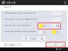 为[Restrict Share Device Information](限制共享设备信息)选择[On](打开) → 按[OK](确定)。