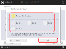 可以在本机上[TLS设置]内的[指定允许的版本]中设置TLS版本的上限和下限。有关更改本机TLS版本的信息,请参阅“用户指南”