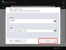 [Name](名称)和[URL]会自动显示。 有关输入字符的说明,请参阅"用户指南"。 已注册的网页被添加到按[  ]时出现的列表中。 “Favorites”(收藏)中最多可以注册20个书签。 最多可以为每个收藏的名称和URL输入255个半角字符。 |