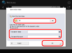 由于Adobe Acrobat设置而不允许打印的PDF文件无法存储在“存储箱”中。 如果没有为选定的PDF文件设置文档密码,则不必输入文档密码。 将带有密码的PDF文件保存在“存储箱”中之后,文件将变为不带密码的文档。要将其作为带有密码的PDF文件发送,必须重新设置密码。 如果选定的“存储箱”设置了PIN,会出现为“存储箱”输入PIN的屏幕。 要确认文件是否已存储,请检查选择为存储接收方的“存储箱”的内容。 如果要输入“Document Password”(文档密码),请输入正确密码。如果输入密码错误,文件将不会存储在“存储箱”中。 打开新的PDF文件时,将PDF文件保存到“存储箱”时设置的存储箱编号、文档编号和文档密码会被清除。但是,如果按[刷新]刷新当前显示的页面,这些设置将不会被清除。 |