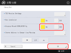 按[Security](安全性) → 为[Display Mixed HTTPS/HTTP Pg](显示HTTPS/HTTP混合网页)选择[On](打开) → 按[OK](确定)。