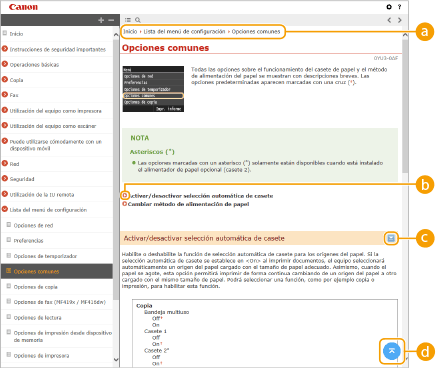 Haga clic para configurar los parámetros que determinan cómo se visualiza el e-Manual, como el diseño o el formato de caracteres.