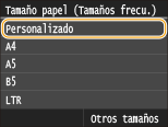 Si la pantalla anterior no aparece cuando hay papel cargadoSi siempre carga el mismo papel en la bandeja multiuso, puede omitir las operaciones de configuración del papel registrando el tamaño y el tipo de papel como opción predeterminada. Sin embargo, si se registra la opción predeterminada, la pantalla anterior no aparecerá. Para visualizar la pantalla, seleccione <Especificar cuando cargue papel> (Registro de las opciones de papel predeterminadas para la bandeja multiuso).