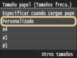 Una vez registradas las opciones de papel predeterminadas, la pantalla de configuración del papel no aparece cuando se carga papel, y se utiliza la misma configuración en todo momento. Si carga un tamaño o tipo de papel diferentes sin cambiar las opciones de papel, es posible que el equipo no imprima correctamente. Para evitar este problema, seleccione <Especificar cuando cargue papel> en el paso 3, y, a continuación, cargue el papel.