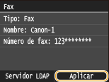 ![]() Si aparece la pantalla de autenticación al pulsar <Iniciar búsq.>, introduzca el nombre de usuario del equipo y la contraseña registrada en el servidor LDAP, y pulse <Aplicar>. Registro de servidores LDAP