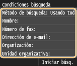 El nombre, los números de fax, las direcciones de e-mail, los nombres de organizaciones y la unidad de la organización son criterios disponibles para buscar destinos.