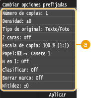 . Si cambia esta configuración predeterminada para adaptarla a las operaciones que realiza con mayor frecuencia, puede eliminar la necesidad de realizar la misma configuración cada vez que realice copias.