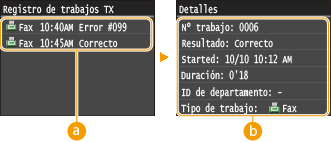 Si <Mostrar registro de trabajos> está establecido en <Off>, no podrá consultar los registros de comunicación. Mostrar registro de trabajos