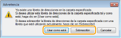 Si los datos de la libreta de direcciones ya existen en la ubicación de almacenamiento especificada en el paso 5, aparecerá el siguiente mensaje. Si desea utilizar la libreta de direcciones existente, haga clic en [Usar como está], y si desea sobreescribirla con la libreta de direcciones actual, haga clic en [Sobrescribir].