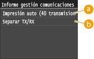 Puede consultar los registros de e-mail y fax de los documentos enviados y recibidos imprimiendo un Informe de gestión de comunicaciones. El informe puede imprimirse automáticamente cada 40 transmisiones, o puede imprimirlo manualmente.