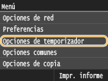 Todas las opciones sobre el temporizador se muestran con descripciones breves. Las opciones predeterminadas aparecen marcadas con una cruz (