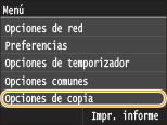 Todas las opciones sobre la copia se muestran con descripciones breves. Las opciones predeterminadas aparecen marcadas con una cruz (