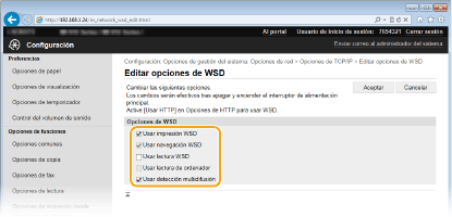 Seleccione la casilla de verificación para obtener información sobre el equipo desde un ordenador a través de WSD. Esta casilla de verificación se selecciona automáticamente cuando se marca la casilla de verificación [Usar impresión WSD]. [Usar lectura WSD]
