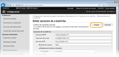 Utilice la IU remota para configurar las opciones detalladas de envío y recepción, como pueden ser las opciones para utilizar el equipo para enviar y recibir I-Faxes y las opciones para la autenticación POP y el cifrado de la comunicación antes de enviar e-mails o I-Faxes. Póngase en contacto con su proveedor o administrador de red para obtener la configuración necesaria.