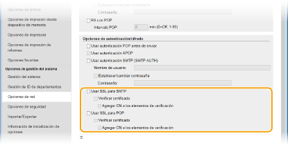 Marque la casilla de verificación para cifrar la comunicación con el servidor POP3 utilizando TLS. Marque las casillas de verificación [Verificar certificado] y [Agregar CN a los elementos de verificación] según sea necesario.