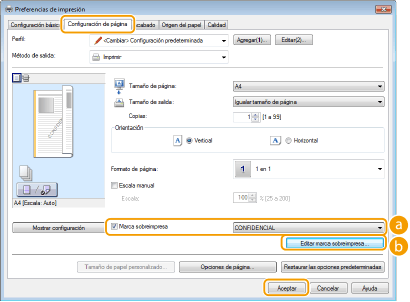 Puede imprimir marcas sobreimpresas tales como "COPIA" o "CONFIDENCIAL" en el documento. Puede crear nuevas marcas sobreimpresas o utilizar marcas sobreimpresas registradas previamente.