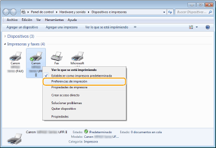 Haga clic con el botón derecho del ratón en el icono del controlador de impresora de este equipo y haga clic en [Preferencias de impresión].