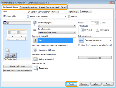 Haga clic en la pestaña [Configuración básica], [Configuración de página], [Acabado], [Origen del papel] o [Calidad] para especificar las opciones de impresión en cada pantalla según sea necesario. Varias opciones de impresión