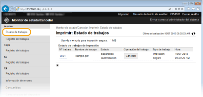 Haga clic en [Nº trabajo] en los documentos pausados y protegidos para mostrar información detallada. Puede consultar el nombre de usuario y el número de páginas del documento impreso.