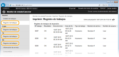 Se muestra el historial de impresión, copia, envío de faxes/e-mails (TX) o recepción de faxes (RX).