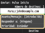 Cuando especifique varios destinos, el segundo destino y siguientes deberán estar guardados en la libreta de direcciones o en un servidor LDAP. En el campo CC/CCO solo se puede especificar destinos que estén guardados en la libreta de direcciones. Para utilizar la libreta de direcciones o un servidor LDAP, deberá completar el procedimiento de guardado previamente.