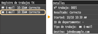 Cuando <Mostrar registro de trabajos> esté establecido en <Off>, no podrá comprobar los registros de los documentos enviados. Mostrar registro de trabajos