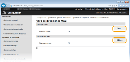 Si las direcciones MAC se introducen de forma incorrecta, es posible que no pueda acceder al equipo desde la IU Remota, en cuyo caso deberá establecer <Filtro de direcciones MAC> en <Off>. Filtro de direcciones MAC