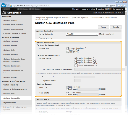 Seleccione esta opción para especificar una única dirección IPv4 o un rango de direcciones IPv4 para aplicar IPSec.Introduzca la dirección IPv4 (o el rango de direcciones) en el cuadro de texto [Direcciones para establecer manualmente].