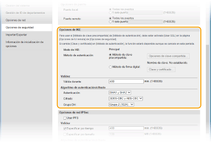 Especifique las opciones [Válida durante] y [Autenticación]/[Cifrado]/[Grupo DH].