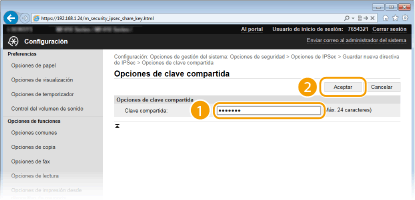 Introduzca hasta 24 caracteres alfanuméricos para la clave precompartida y haga clic en [Aceptar].